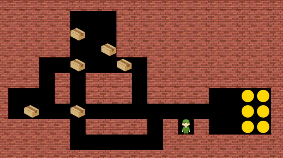 - プレイヤー(主人公)を操作して、荷物(箱)を目的地まで運ぶ パズルゲームです。 壁や通路の配置を考えながら、箱を押してすべてのゴールに運ぶとクリアです。